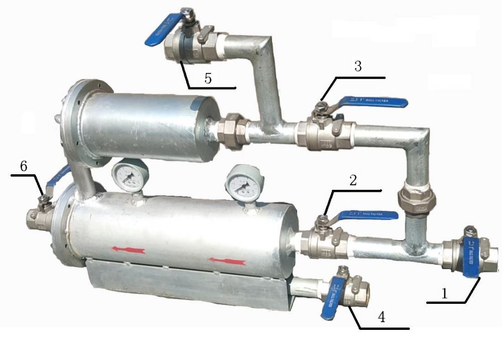 IV、 副過濾器反沖洗過濾:依次打開1、2號進水口閥門、5號副過濾器排污閥門;依次關(guān)閉3號反沖洗閥門、6號出水口閥門、4號主過濾器排污閥門,水由進水口閥門進入主過濾器過濾,反方向進入副過濾器對濾芯進行反沖洗,污水由副過濾器排污閥門排出;副過濾器反沖洗完成